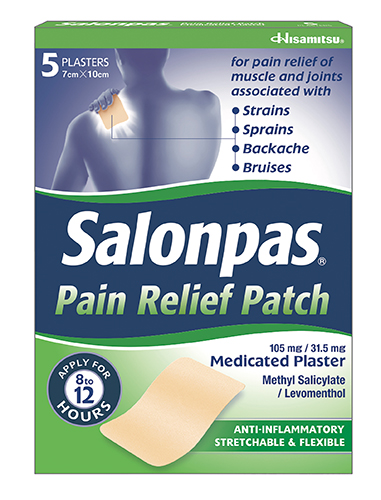 Salonpas Pain Relief Patch contains Methyl Salicylate; Levomenthol. Indications: For the symptomatic relief of pain of muscles and joints associated with strains and sprains. Legal category: GSL. Information about this product, including adverse reactions, precautions, contraindications and method of use can be found at https://mhraproducts4853.blob.core.windows.net/docs/cb33848847c9478298fb83815543cee8cee6c291 Marketing authorisation number: PL 23168/0001. Further information is available from Licence Holder: Hisamitsu UK Limited, 5 Chancery Lane, London WC2A 1LG, UK. Last revised: February 2020.